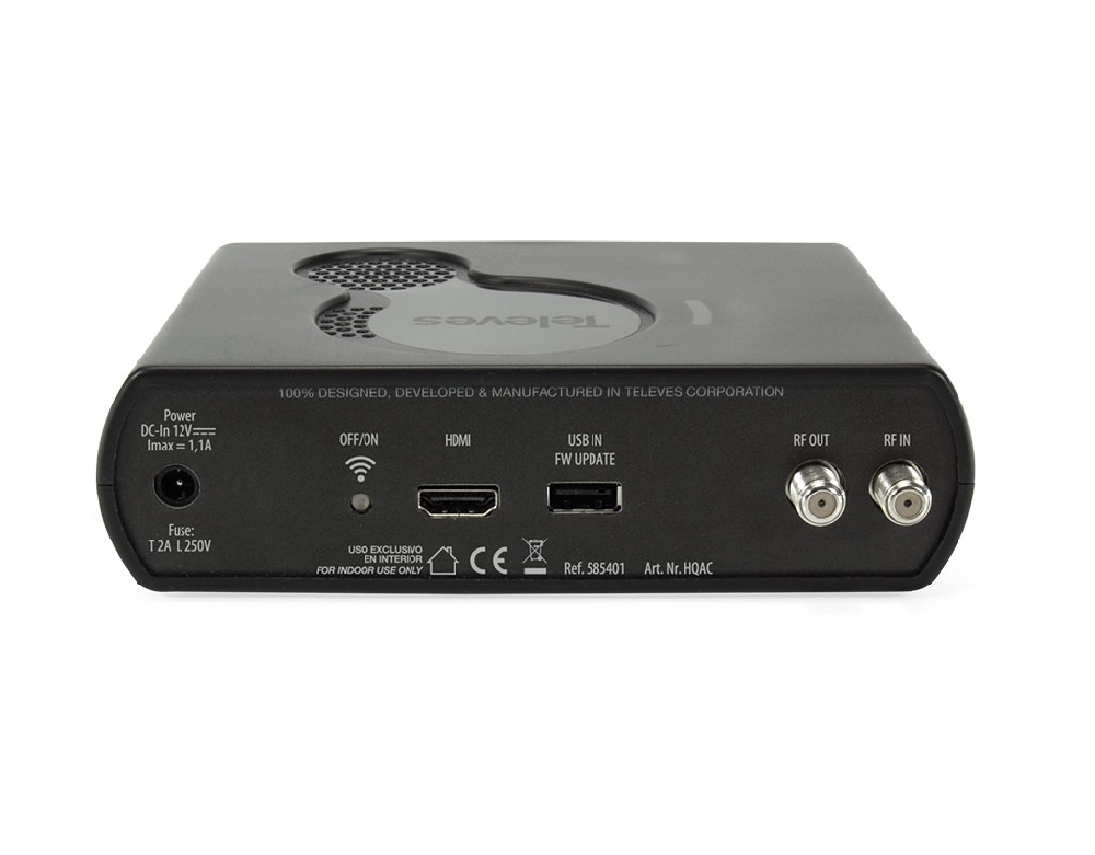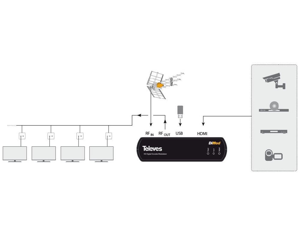 Ο ψηφιακός διαμορφωτής 585401 DiMod της Televes, διαμορφώνει σήμα Audio/Video απο συσκευές με έξοδο HDMI (δέκτες δορυφορικού & επίγειου ψηφιακού τηλεοπτικού σήματος, κάμερες, DVD και κάθε άλλη πηγή σήματος Audio/Video SD/HD) σε ψηφιακό σήμα DVB-T MPEG-4 ή MPEG-2 αλλά και σε DVB-C σήμα, για θέαση ή διανομή σε δέκτη επίγειων ψηφιακών/καλωδιακών τηλεοπτικών καναλιών ή σε τηλεοράσεις με ενσωματωμένο δέκτη DVB-T/T2, MPEG-2, MPEG-4 ή DVB-C. Διαθέτει USB θύρα για αναβάθμιση λογισμικού και για αναπαραγωγή αρχείων μορφής ".ts" ενώ παρέχει έλεγχο και προγραμματισμό μέσω WiFi. Μέσω της λειτουργίας VBR (Variable Bit Rate) παράγει υψηλής ποιότητας κωδικοποίηση και μπορεί να δεχτεί αναλύσεις HDMI έως και 1080p@60fps τις οποίες προσαρμόζει αυτόματα σε 1080p@30fps.