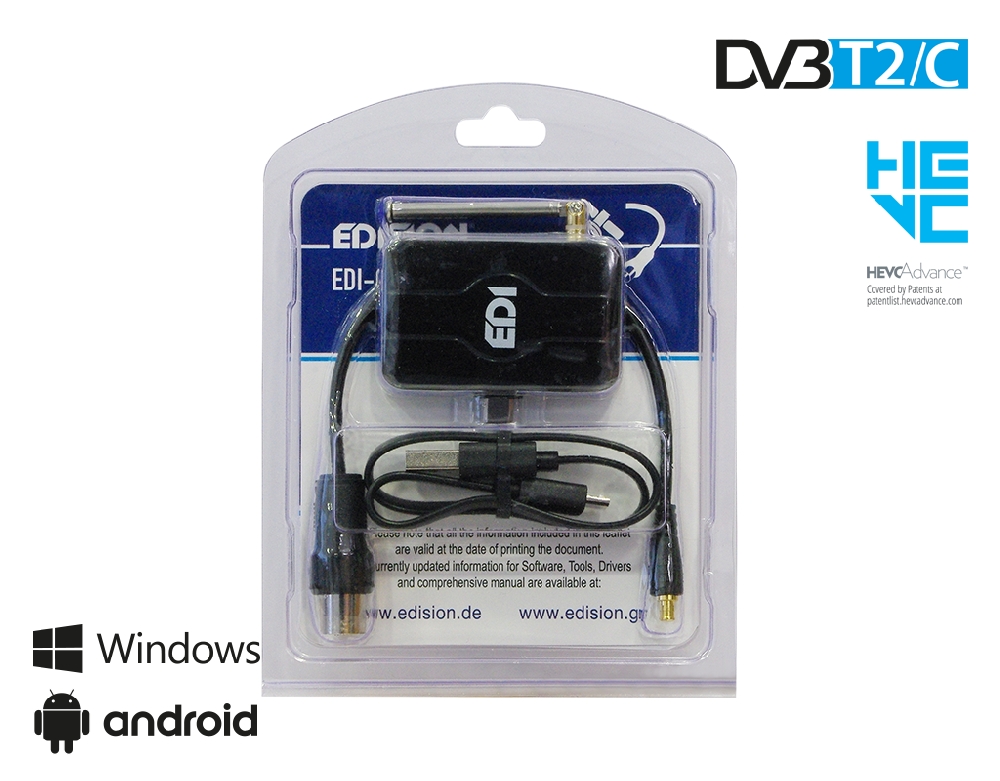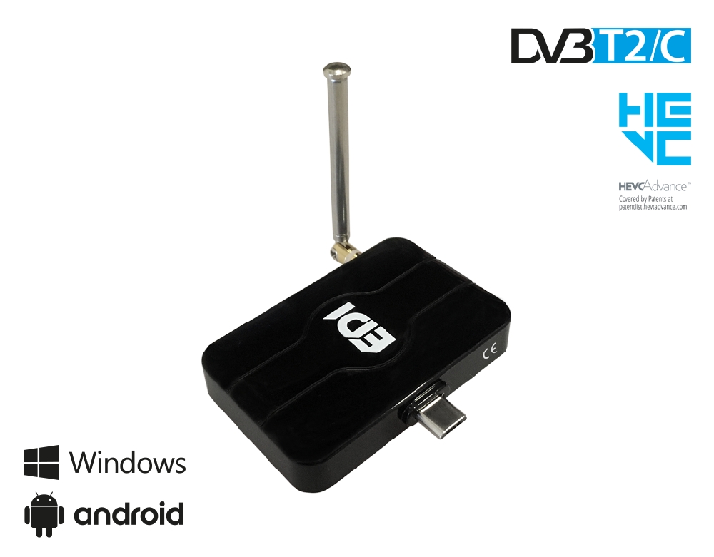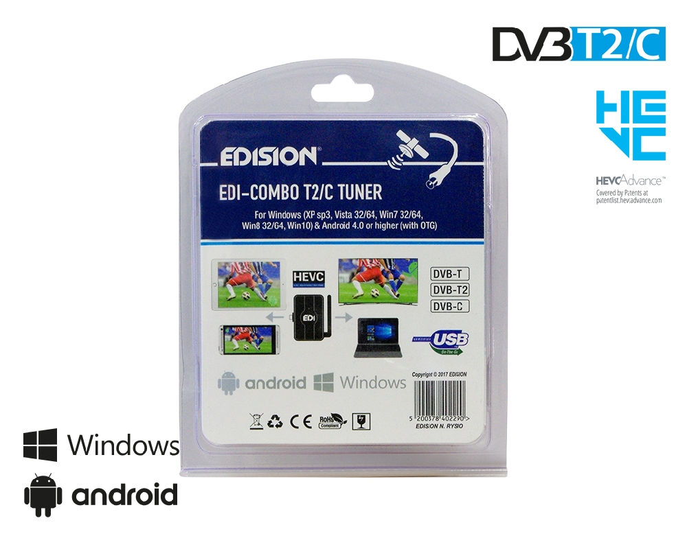 EDI-COMBO brings digital television and radio to every PC, tablet-pc, smartphone and Android tv box! Just connect the EDI-COMBO T2/C USB Tuner to the USB port of a PC (windows) or to an Android smart device, instal the ''EDI-COMBO PLAYER'' App and enjoy your favourite TV programs wherever you are, through your PC / Laptop / Tablet-PC and smartphone! It features advanced, high-end DVB-T/T2/C tuner to provide you with enjoyable tv viewing of all your favourite Free-to-Air digital terrestrial and cable FullHD channels that it is possible to receive in the installation site. Plus, it is compatible with H.265 HEVC format! It also offers you extra functions, such as recording and Electronic Program Guide (EPG) for keeping you updated with all the information regarding your favourite channels and tv programs!