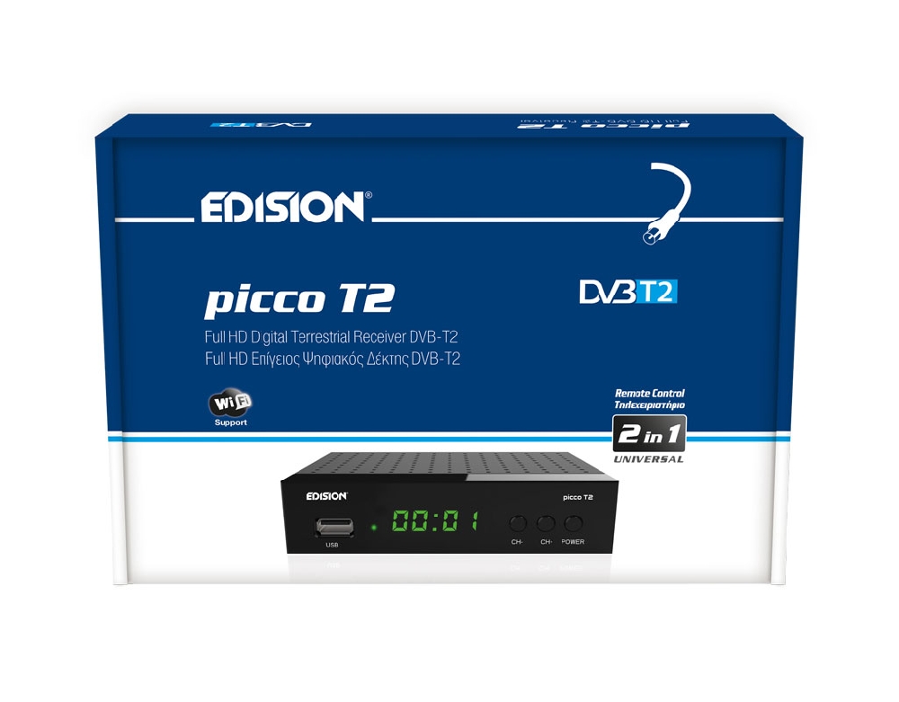 EDISION PICCO T2 is an H.264, MPEG4, Full High Definition DVB-T2 receiver, with improved menu surfing and user experience. It has 4-Digit LED Display, USB WiFi support, front panel buttons for Power ON/OFF and Channel -/+ plus Universal Remote Control 2in1 for the receiver and the TV, with four LG/SAMSUNG(*) default settings which can be also programmable. It also features PVR function and external IR port in order to connect a Jack-to-IR cable and make the receiver "invisible"! Your best TV friend, with more features from EDISION!